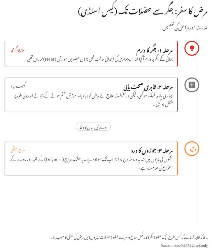 ایک مریض کے جگر پر ورم (Liver Inflammation) تھا، جو بظاہر ٹھیک ہوگیا۔ لیکن اس کے دو یا تین سال بعد اس کے جسم کے ٹخنوں کی ہڈیوں میں درد شروع ہوگیا، جو لاعلاج محسوس ہونے لگا۔ اس کے ساتھ ہی مریض کا ذہن کمزور ہوگیا، بھولنے کی بیماری لاحق ہوگئی، اور غصہ و چڑچڑا پن بڑھ گیا 2۔