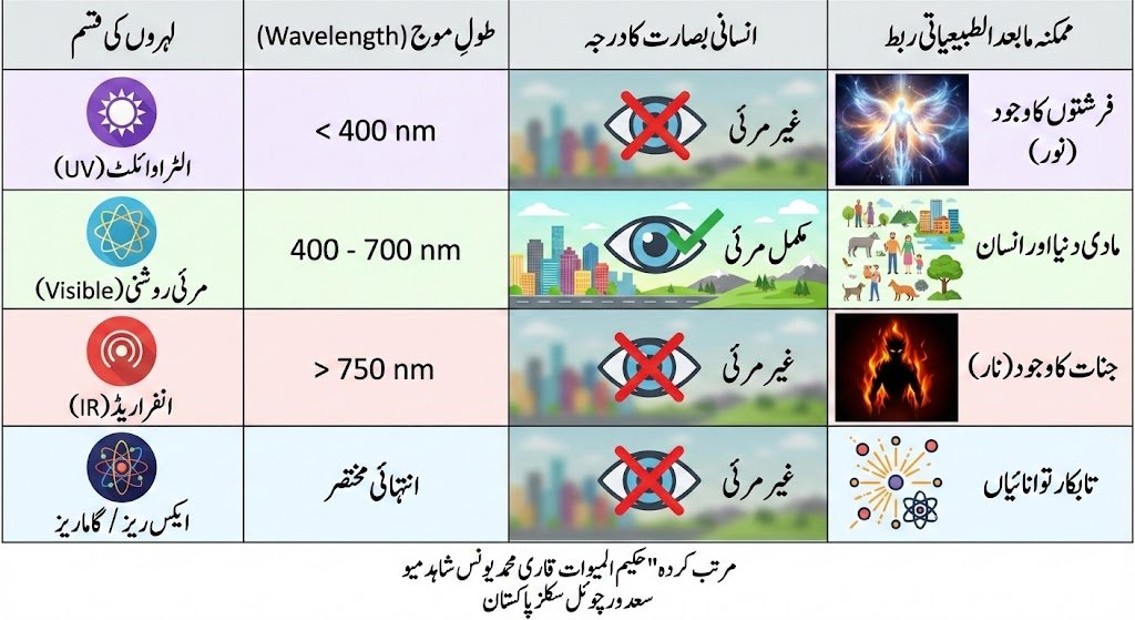 الٹرا وائلٹ (UV) < 400 nm غیر مرئی فرشتوں کا وجود (نور) مرئی روشنی (Visible) 400 – 700 nm مکمل مرئی مادی دنیا اور انسان انفراریڈ (IR) > 750 nm غیر مرئی جنات کا وجود (نار)