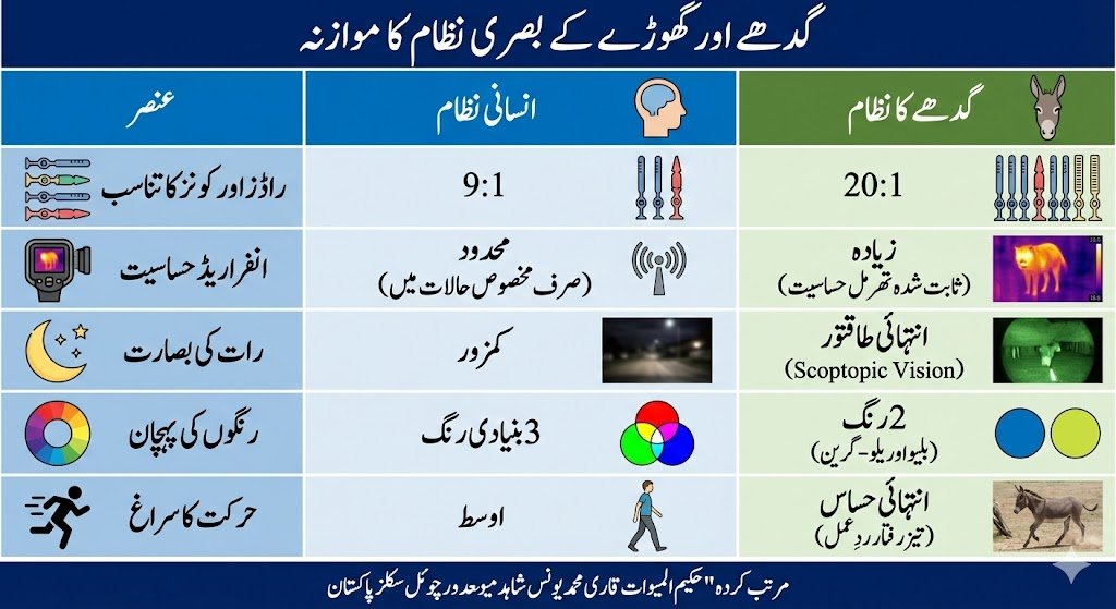 گدھے کا بصری نظام انسانوں سے مختلف ہے اور اس میں رات کے وقت دیکھنے کی غیر معمولی صلاحیت ہوتی ہے 25۔ گدھے کی آنکھ میں راڈ ٹشوز (Rod Tissues) کی تعداد انسانوں کے مقابلے میں بہت زیادہ ہوتی ہے، جس کی وجہ سے وہ اندھیرے میں بھی باریک ترین سائے اور حرارتی لہروں کو محسوس کر سکتا ہے 25۔