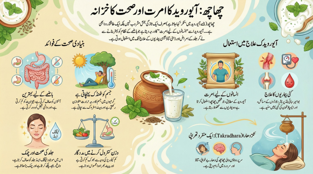 آیور وید (Ayurveda) میں چھاچھ کو “تکر” (Takra) کہا جاتا ہے اور اسے انسانی جسم کے لیے ایک مقدس مشروب اور دوا تسلیم کیا گیا ہے 14۔ آیور ویدک فلسفے کے مطابق چھاچھ بھاری پن پیدا نہیں کرتی (Laghu)، ذائقے میں کھٹی اور کسیلی ہوتی ہے اور ہاضمے کی آگ (Agni) کو تیز کرتی ہے 14۔