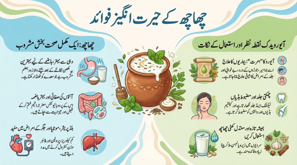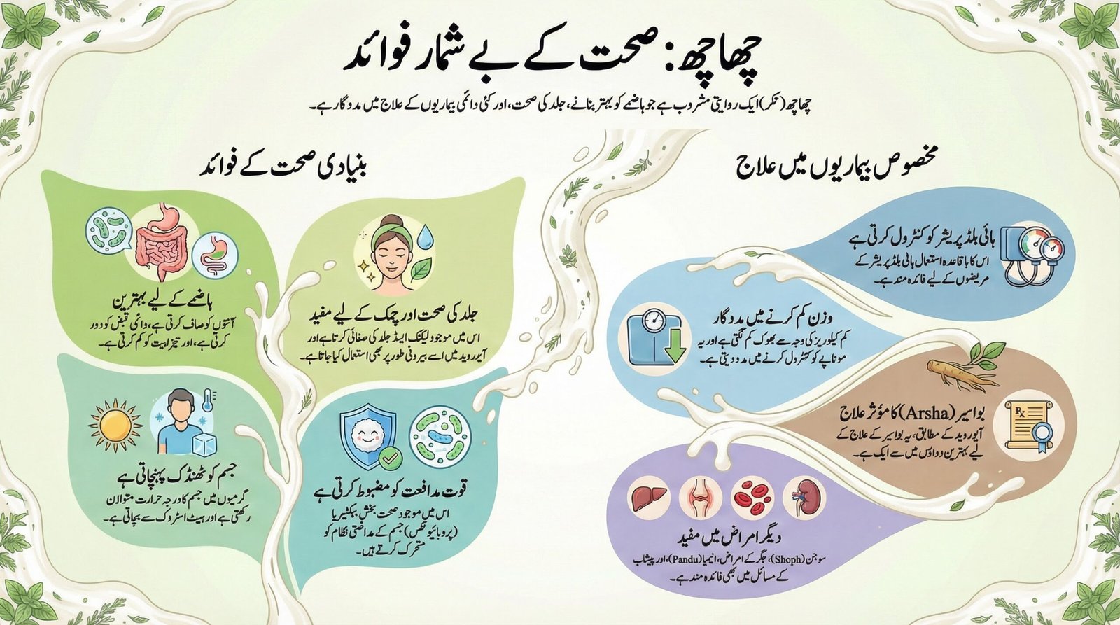 مصر کے شاہی حماموں تک پھیلی ہوئی ہیں 2۔ موجودہ سائنسی تحقیق نے ان قدیم روایات کی تصدیق کرتے ہوئے یہ ثابت کیا ہے کہ چھاچھ میں موجود لییکٹک ایسڈ (Lactic Acid)، پروبائیوٹکس (Probiotics) اور وٹامنز کا مجموعہ جلد کی ساخت کو بہتر بنانے، خلیات کی تجدید کرنے اور پیچیدہ جلدی امراض کے علاج میں حیرت انگیز اثرات مرتب کرتا ہے 4۔