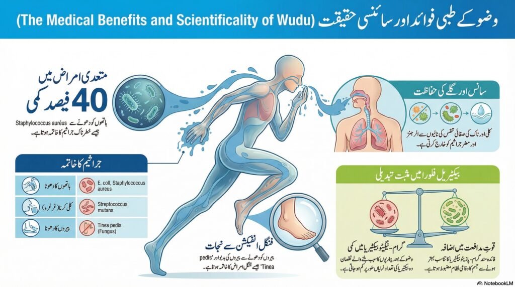 میں رہتے ہیں۔ جدید مائیکرو بائیولوجی کے مطابق، ہاتھ، چہرہ، ناک اور پیر وہ بنیادی راستے ہیں جن کے ذریعے جراثیم انسانی جسم میں داخل ہوتے ہیں۔ وضو کے دوران ان اعضاء کی بار بار صفائی نہ صرف مٹی اور آلودگی کو دور کرتی ہے بلکہ جلد پر موجود جراثیم کے بوجھ (Bacterial Load) کو بھی نمایاں طور پر کم کرتی ہے 11۔