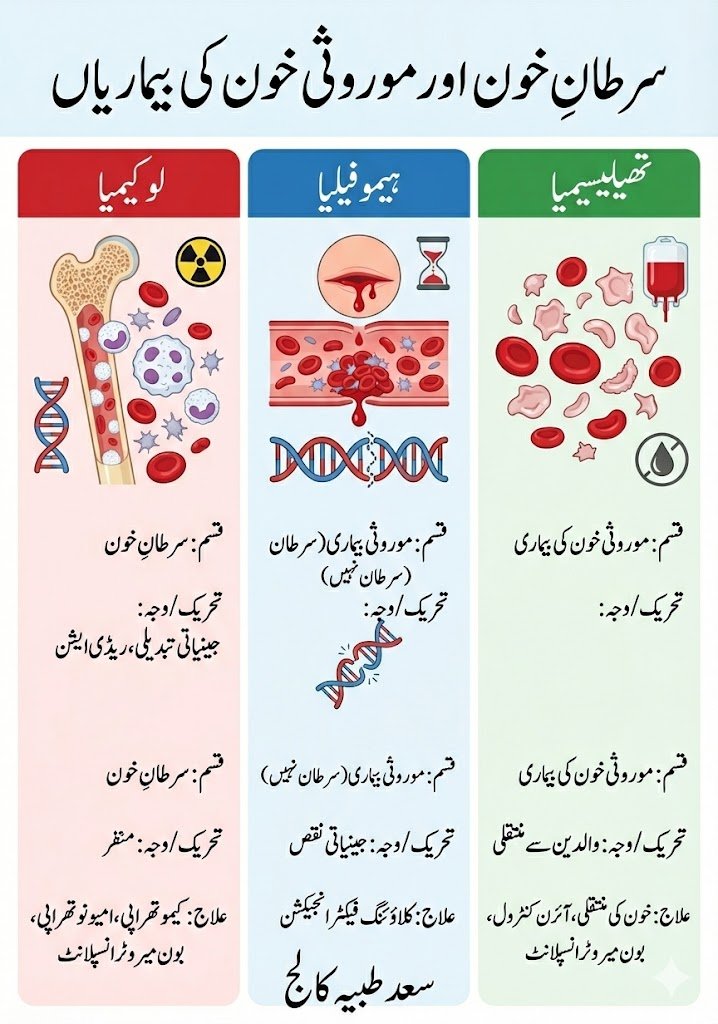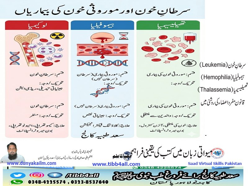 اس تناظر میں، لیوکیمیا، ہیموفیلیا اور تھیلیسیمیا محض “خون” کی خرابی نہیں ہیں، بلکہ خون بنانے والے کارخانوں (جگر، تلی، ہڈیوں کا گودا) کے فعل میں بگاڑ کا نتیجہ ہیں۔