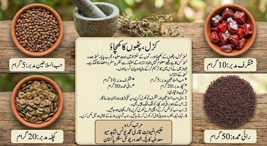 1. اجزاء کو مدبر (Purify) کرنے کے طریقےحب السلاطین (جمال گوٹا) کو مدبر کرنا: اس کے بیجوں کو چھیل کر اندر سے سفید مغز نکال لیا جاتا ہے۔ اس مغز کے درمیان ایک باریک سا پتا (Embryo) ہوتا ہے جسے نکالنا لازمی ہے کیونکہ وہی اصل زہر ہے۔ اس کے بعد مغز کو ململ کے کپڑے میں باندھ کر پوٹلی بنا لیں اور اسے دودھ میں لٹکا کر (Dola Yantra) ابالیں، یہاں تک کہ اس کا تیل نکل جائے اور وہ مصلح ہو جائے۔شنگرف کو مدبر کرنا: شنگرف کو عام طور پر “ادرک کے پانی” یا “لیموں کے رس” میں کھرل کیا جاتا ہے۔ اسے کئی گھنٹوں تک مسلسل کھرل کیا جاتا ہے یہاں تک کہ وہ بالکل باریک غبار کی طرح ہو جائے اور اس کی چمک ختم ہو جائے۔کچلہ کو مدبر کرنا: کچلہ کے بیجوں کو سات دن تک تازہ دودھ یا پانی میں بھگو کر رکھا جاتا ہے (روزانہ دودھ/پانی بدلا جاتا ہے)۔ جب وہ نرم ہو جائیں تو ان کا چھلکا اتار کر اندر سے باریک پتا نکال دیا جاتا ہے۔ اس کے بعد اسے دیسی گھی میں ہلکا براؤن (بریاں) کیا جاتا ہے تاکہ وہ پسنے کے قابل ہو جائے۔2. دورانِ علاج ضروری پرہیز (Dietary Precautions)چونکہ یہ نسخہ مزاجاً گرم اور خشک ہے، اس لیے اس کے استعمال کے دوران خوراک کا خاص خیال رکھنا ضروری ہے:ان چیزوں سے بچیں:ترش اور کھٹی اشیاء (اچار، دہی، لیموں، املی)۔بادی اور ثقیل غذائیں (بڑا گوشت، چاول، دال ماش، آلو، گوبھی)۔انتہائی ٹھنڈا پانی یا برف کا استعمال۔ان چیزوں کا استعمال بڑھائیں:دیسی گھی اور مکھن (تاکہ جسم میں خشکی نہ ہو)۔بکری یا مرغی کی یخنی۔نیم گرم دودھ (رات کو سونے سے پہلے)۔مربہ ہریڑ یا مربہ بہی۔3. مرتب کردہحکیم المیوات قاری محمد یونس شاہد میو سعد طبیہ کالج – سعد ورچوئل سکلز پاکستان